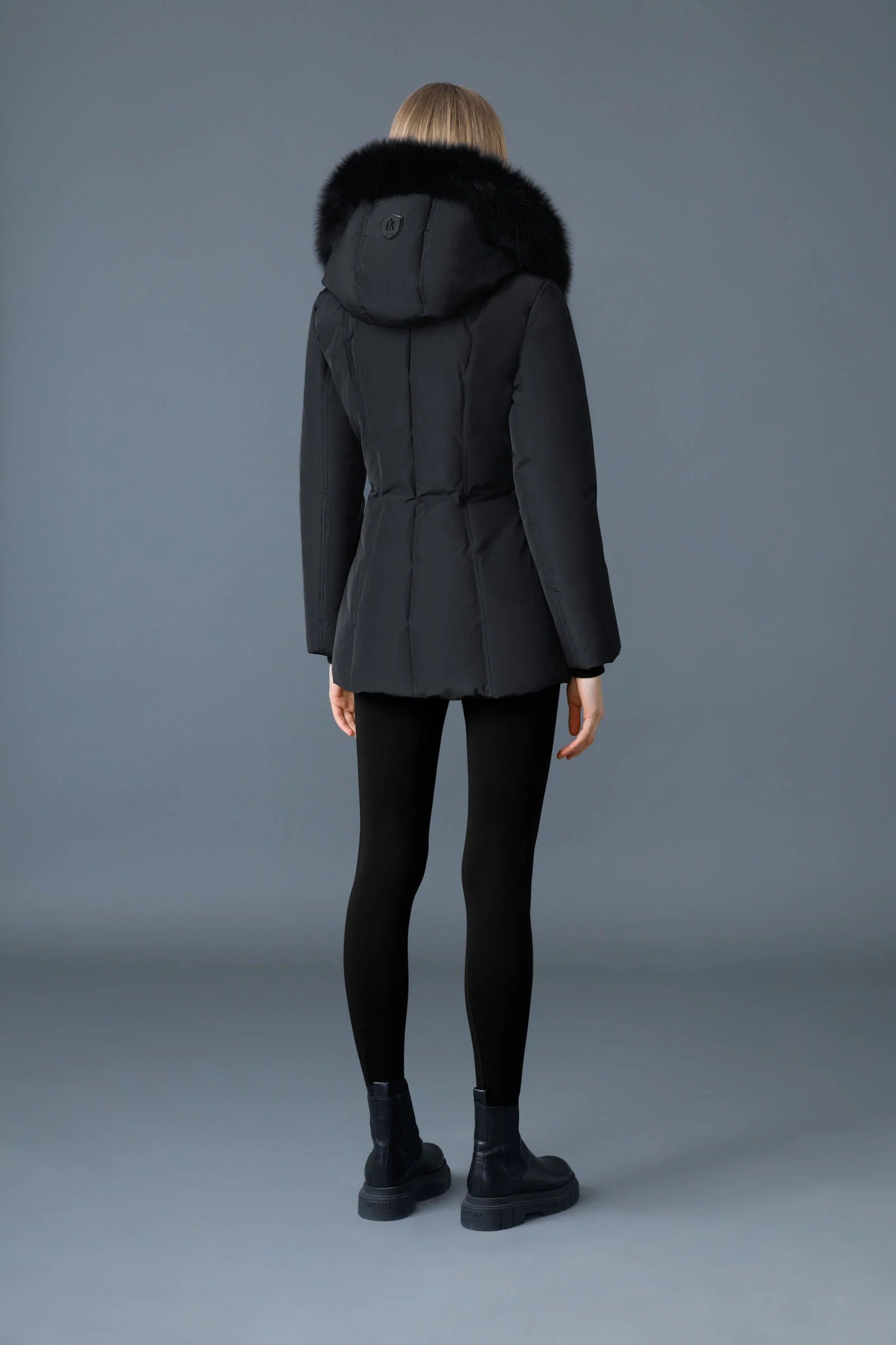 ADALI-BX is a recycled down coat for women featuring our Signature Collar with blue fox fur and an asymmetrical zip closure. Lab tested to protect with weight-to-protection ratio, it has an inner bib with rib collar, hidden hood toggle, and storm cuffs. Water resistant, repellent, and windproof, insulated leather welt pockets add warmth and protection. A design-forward winter essential elevated with thoughtful tailoring.