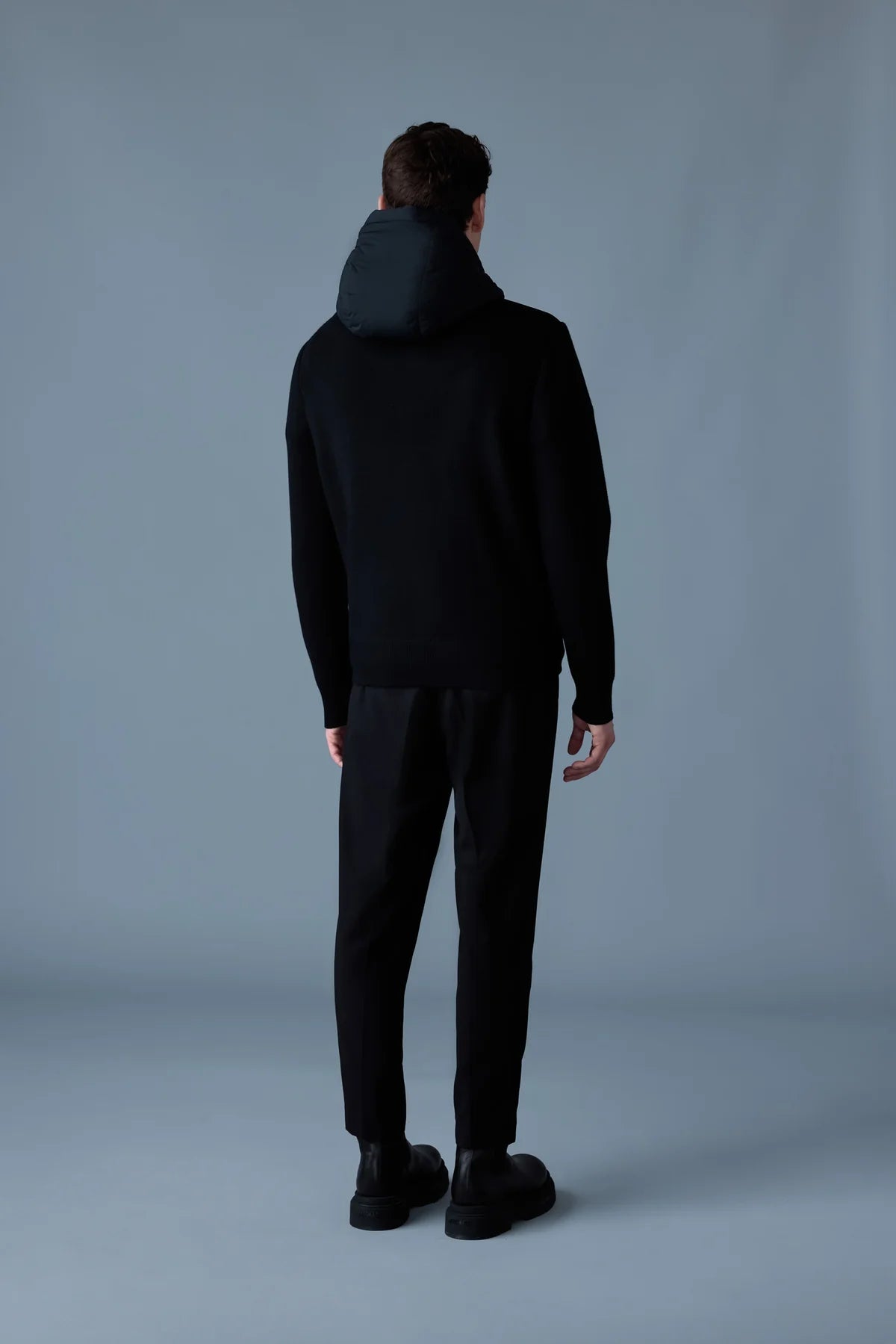 ANDREW-Z is a light down quilted jacket with a non-removable hood. Cut to a regular fit, super soft knit adorns sleeves, back, and waistband for a hybrid style. Zip waist pockets provide ample storage while signature M at chest adds subtle detailing. A highly wearable modern performance piece.