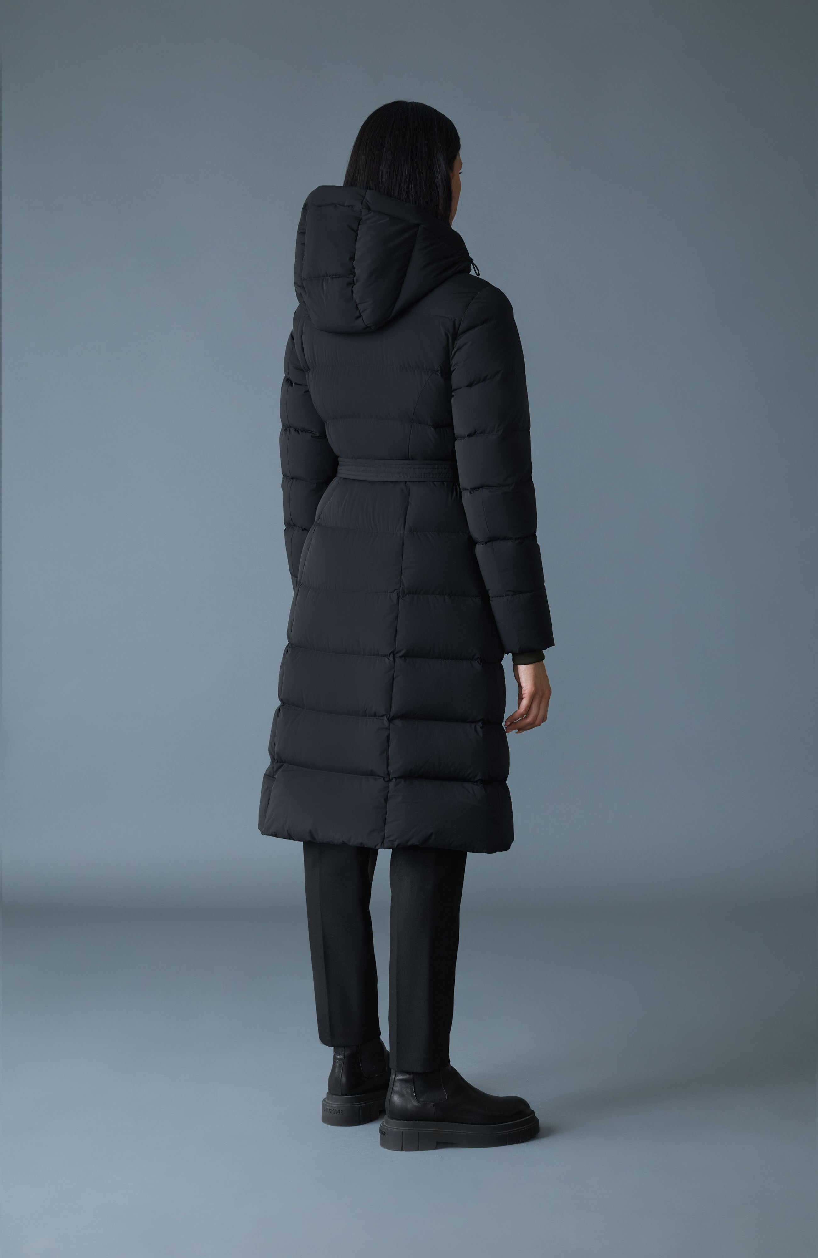CORALIA-CITY is a fitted, long down coat engineered for cold-weather protection without the bulk. Featuring a water-resistant zipper at the center front and pockets, this streamlined silhouette includes a hood with an adjustable storm visor, insulated interior, and storm cuffs. A removable belt with buckle allows for a customizable cinch at the waist, while the recycled down fill ensures superior warmth. Finished with “MACKAGE” silicone branding on the chest for signature appeal.