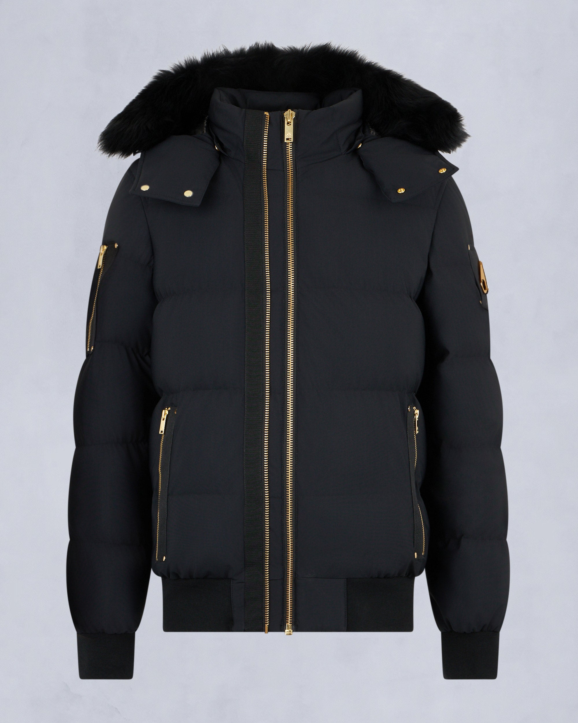 - Removable hood with removable shearling trim