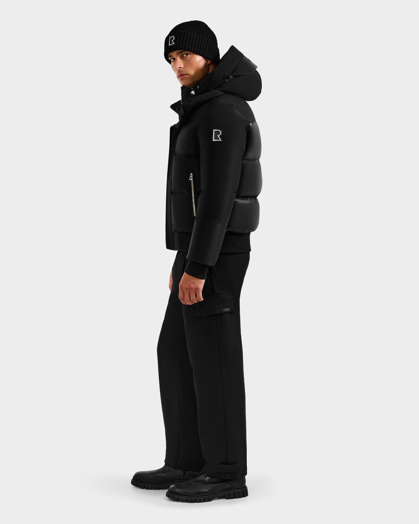 The JORDY H by RUDSAK is a men’s quilted down bomber that blends utility and style. Insulated with responsibly sourced RDS-certified down, it delivers dependable winter warmth. Designed with a removable hood featuring a hideaway branded visor, vegan leather trims, and sleek silver hardware, this bomber balances modern edge with technical function. Inner backpack straps add versatility, while its timeless silhouette makes it a cold-weather essential that moves seamlessly from city streets to outdoor pursuits.