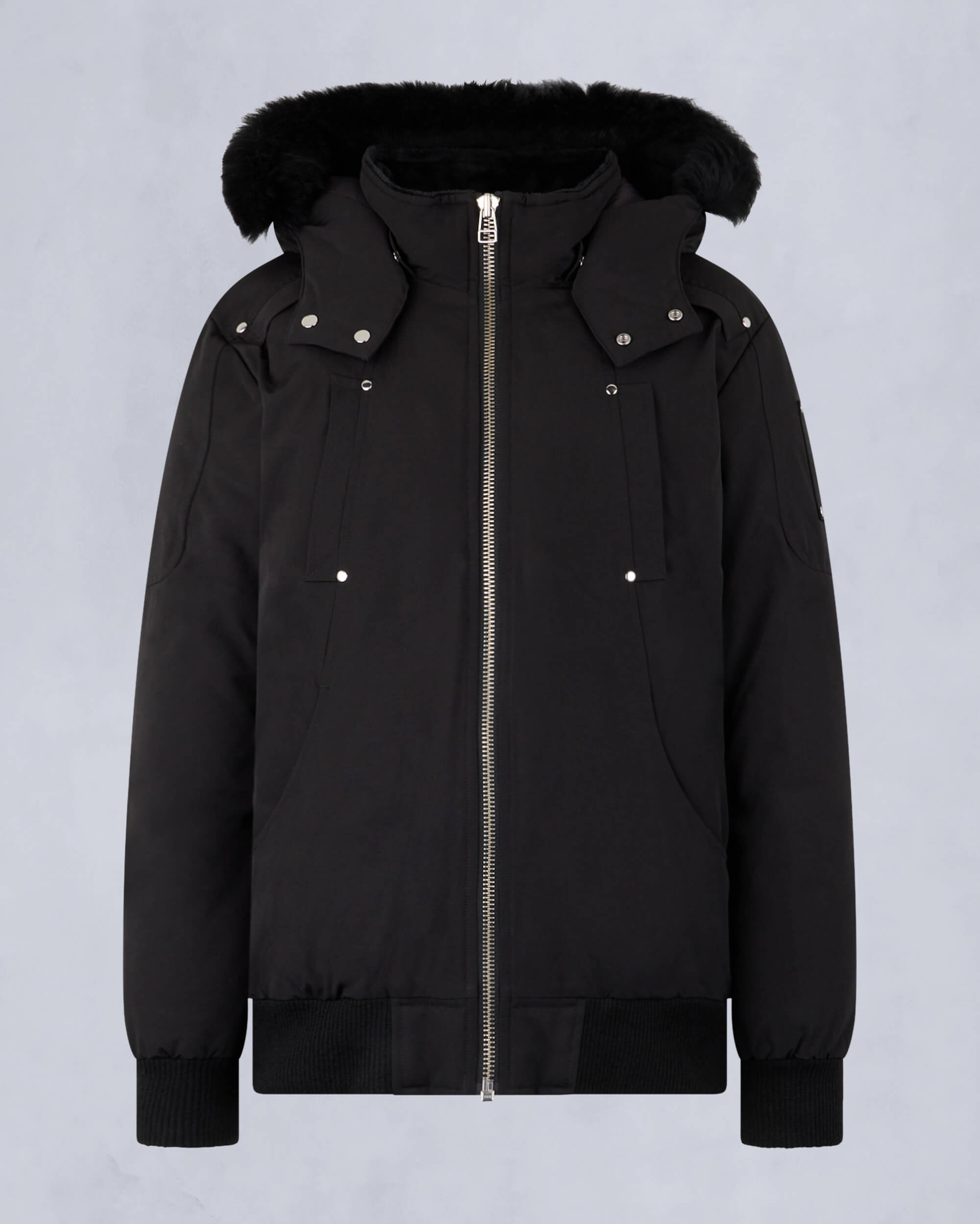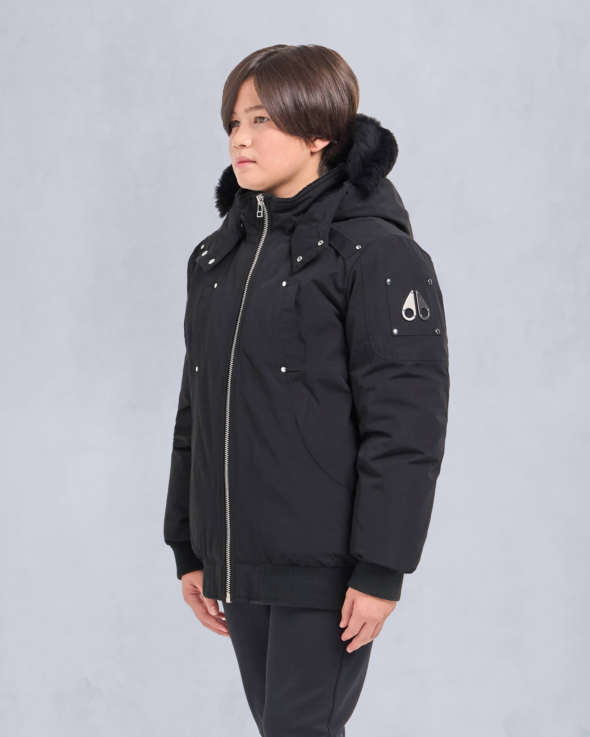 The Unisex Bomber is the children's version of our classic bomber silhouette. Just like its adult counterparts, the Debbie and Ballistic Bombers, it features classic Moose Knuckles details like the iconic J-seam chest pockets, a luxurious lamb shearling-trimmed hood, and plush rib-knit at the cuffs and waist.
